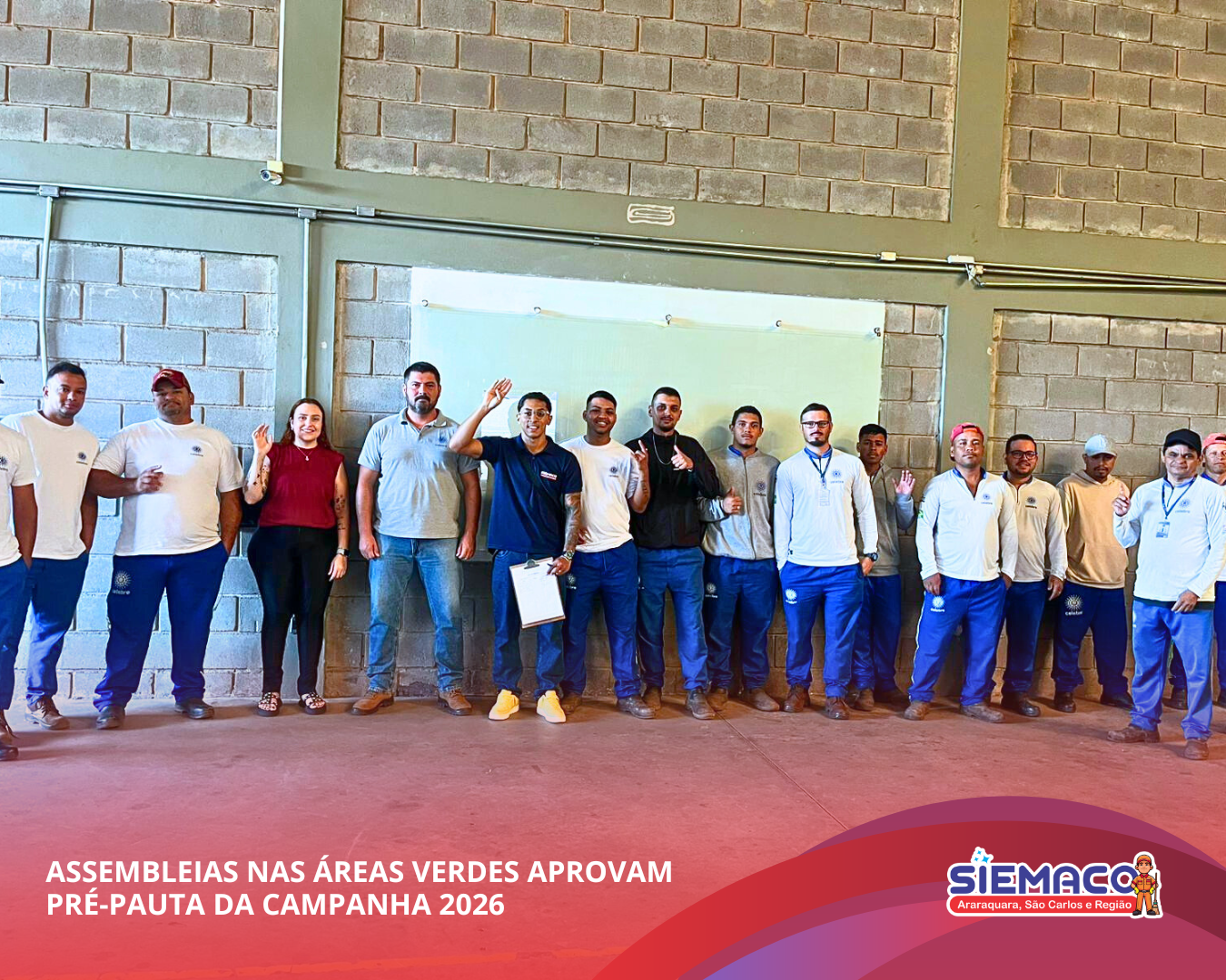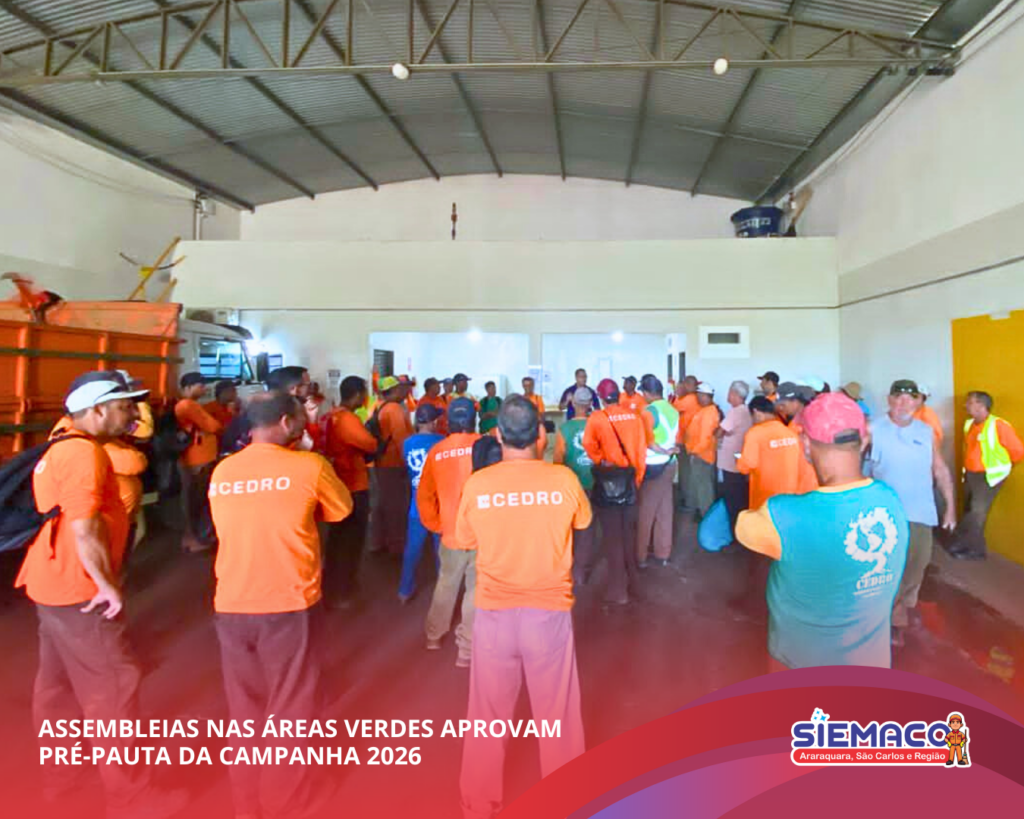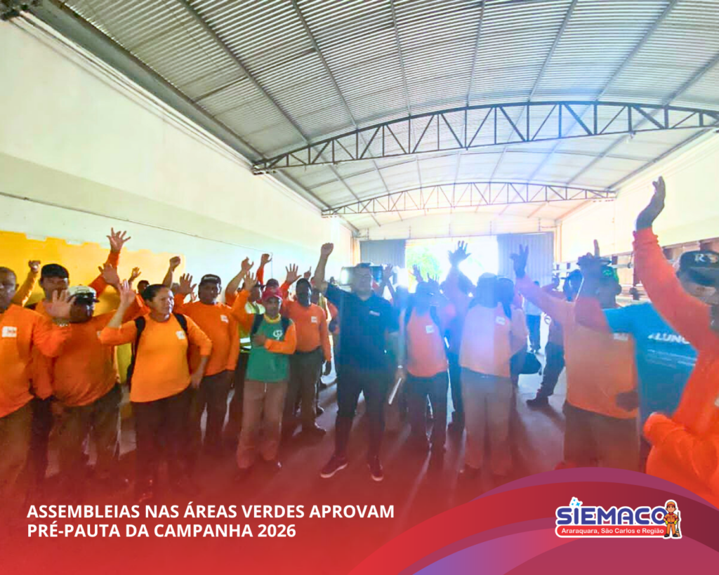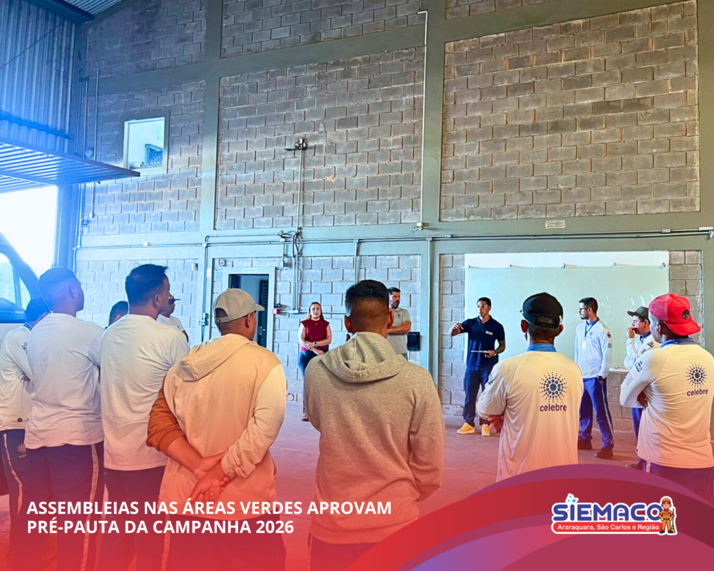 O SIEMACO Araraquara realizou assembleias nos setores de áreas verdes para discutir e deliberar sobre a pré-pauta da Campanha Salarial 2026. Durante os encontros, os trabalhadores participaram ativamente do debate e aprovaram as propostas que irão nortear as negociações, reforçando a importância da união e da participação da categoria.